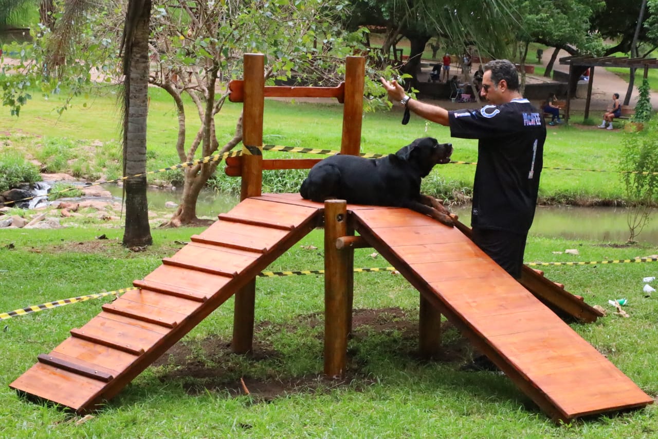 Espaço conta com arcos de pneus sustentados por balizas; barras verticais de obstáculos; túnel de manilha de concreto e rampa de madeira com degraus para fortalecimento muscular