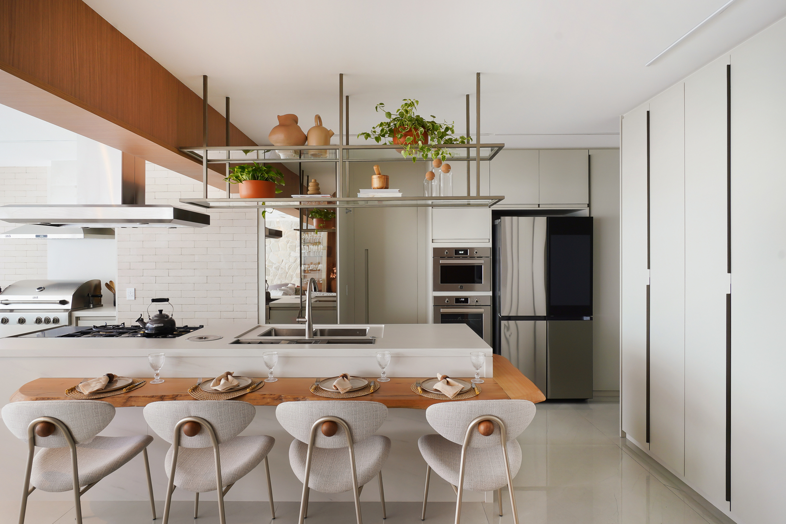 Segundo a arquiteta, a criação de uma bancada central compartilhada entre cozinha e área gourmet melhora a funcionalidade do conjunto. “Essa decisão facilita o preparo dos alimentos e a organização dos utensílios, tanto os específicos da cozinha quanto os de uso compartilhado”, detalha.
