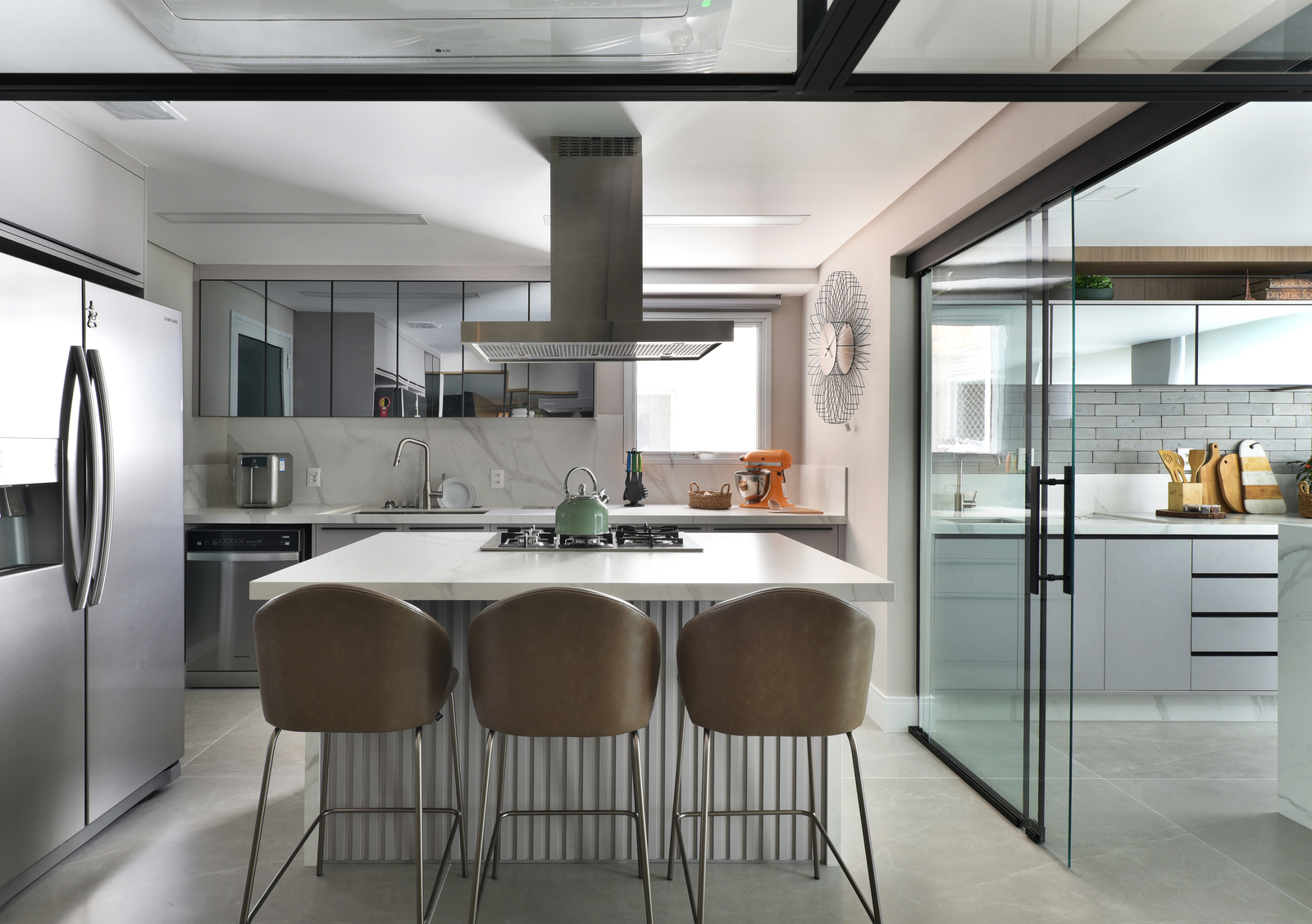 A conexão entre os ambientes também pode ser parcial, mantendo a integração visual sem eliminar completamente a separação. De acordo com Rosangela Pena, portas de vidro, pórticos, brises e cobogós permitem controlar o fluxo entre os espaços sem comprometer a iluminação natural.“Nesse apartamento, abrimos a cozinha para associá-la à varanda, mas essa abertura não precisa funcionar em tempo integral”, explica a arquiteta. O uso do vidro manteve a percepção de amplitude e a entrada de luz natural.