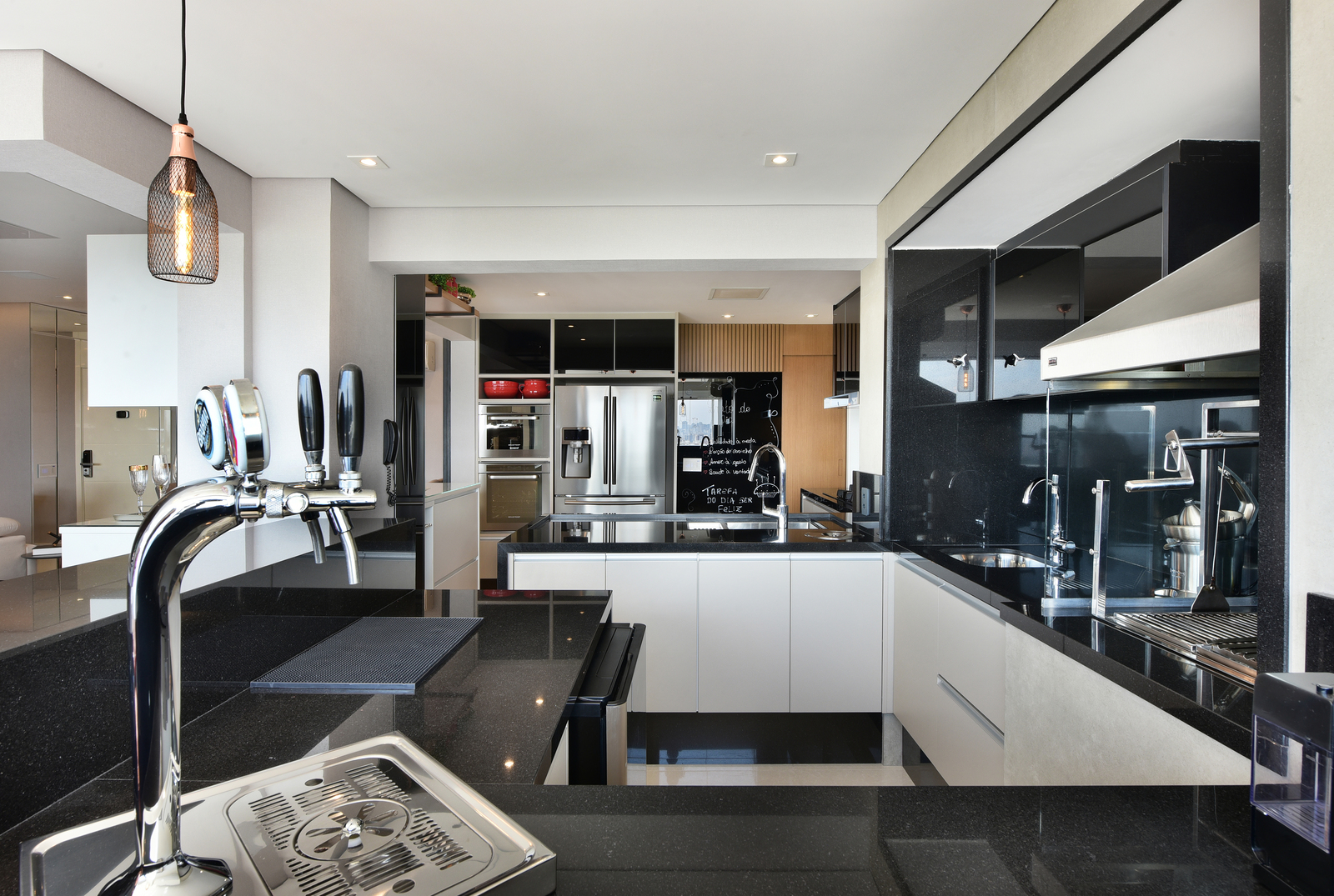 No projeto de integração, a arquiteta também incluiu uma chopeira, reforçando o uso do ambiente para recepção de convidados. Antes da reforma, o apartamento era compartimentado por paredes entre sala, cozinha e varanda. Com a demolição e o novo layout, o imóvel passou a ter maior integração e melhor circulação. (F:oto: Sidney Doll)