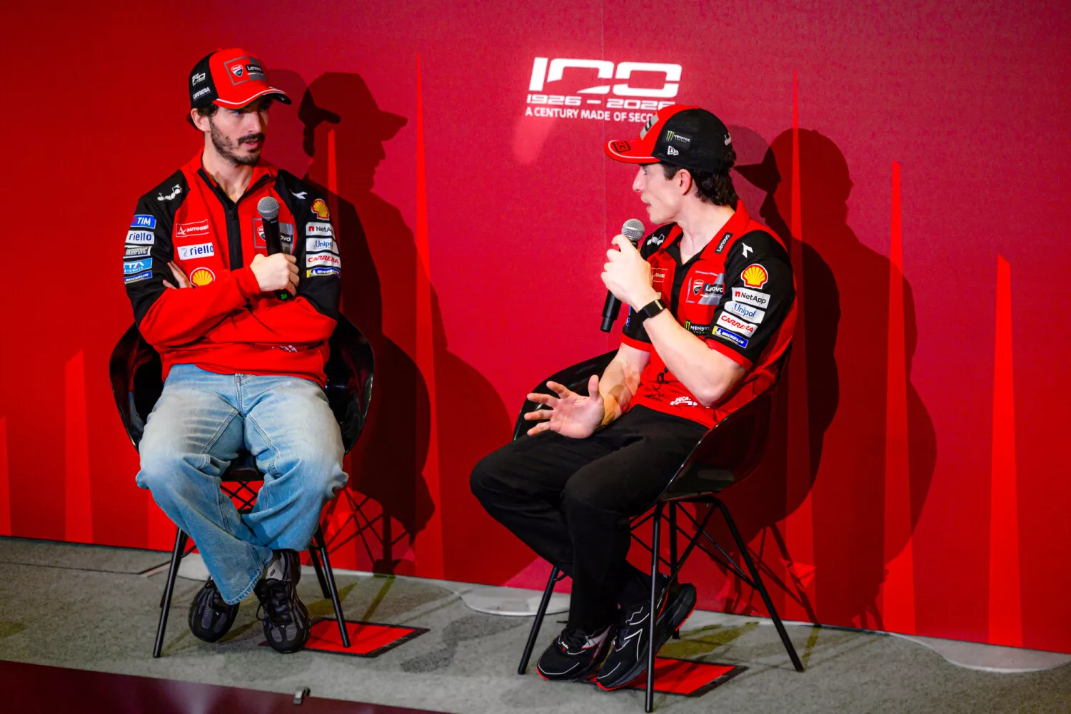 Entre os destaques estavam a Gran Sport Marianna 125, de 1955; a MotoE V21L, primeira motocicleta elétrica da Ducati; a 900 SS IOM TT; a 851 F90, ligada à primeira vitória da marca no Mundial de Superbike; a Desmosedici GP 2007, campeã da MotoGP; a Panigale V4 R, vencedora de quatro títulos de construtores; e a Desmosedici GP 2022, pilotada por Bagnaia em seu título mundial. A exposição teve como tema “Um Século Feito de Segundos”, lema do logotipo comemorativo do centenário da Ducati.
